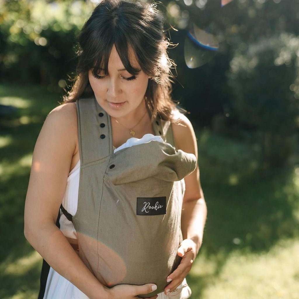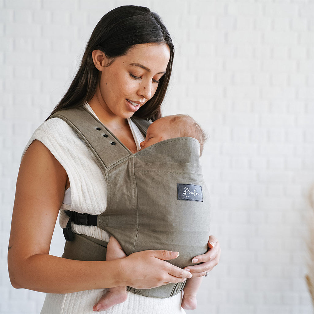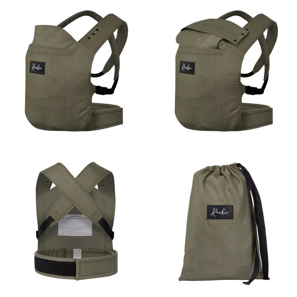 Du erhältst die klassische Rookie Premium Babytrage, die viele praktische Features mit einem minimalistischen Design in einer Bauchtrage kombiniert:
